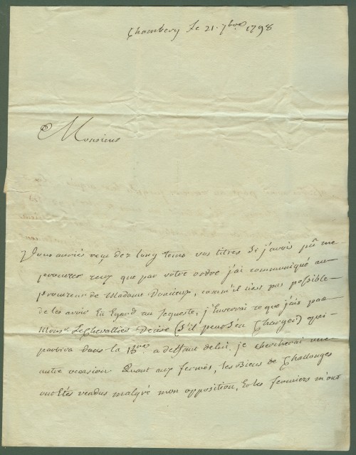 PREFILATELIA. SAVOIA. "P84P CHAMBERY" stampatello nero su due righe al recto di lettera per Torino del 21 Settembre 1798. Indirizzata al conte Salmatoris Rossiglione maestro di cerimonia del Re di Sardegna. Completa di testo. Ottima conservazione. (Rif.C3560)