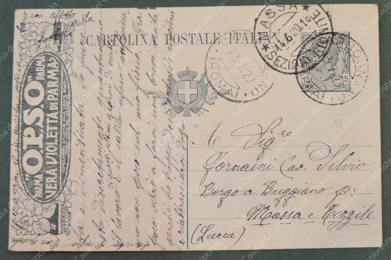 St. postale Regno. O.P.S.O.. Cartolina postale da cent. 15 Leoni con ytassello pubblicitario; viaggiata nel 1920. (Rif.F6857)