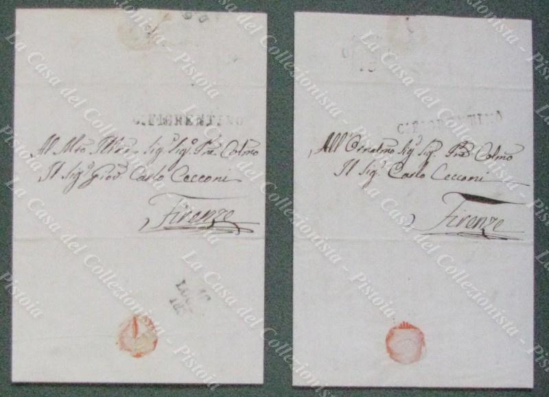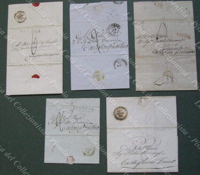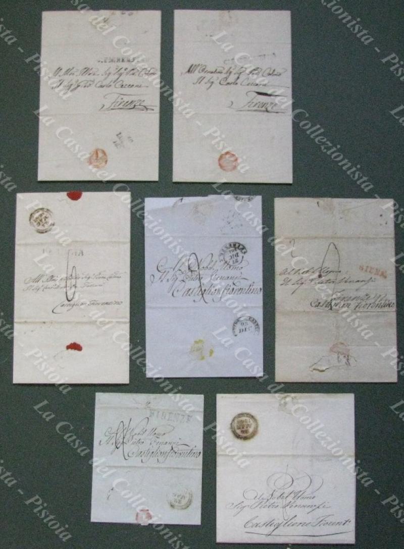TOSCANA. CASTIGLION FIORENTINO. Insieme di 7 lettere. 2 lettere con lineare nero C.FIORENTINO del 1835 e 1839 per Firenze. 5 lettere da Perugia (2), Siena e Firenze (2) per Castiglion Fiorentino. Tutte complete del testo. (Rif.E5371)