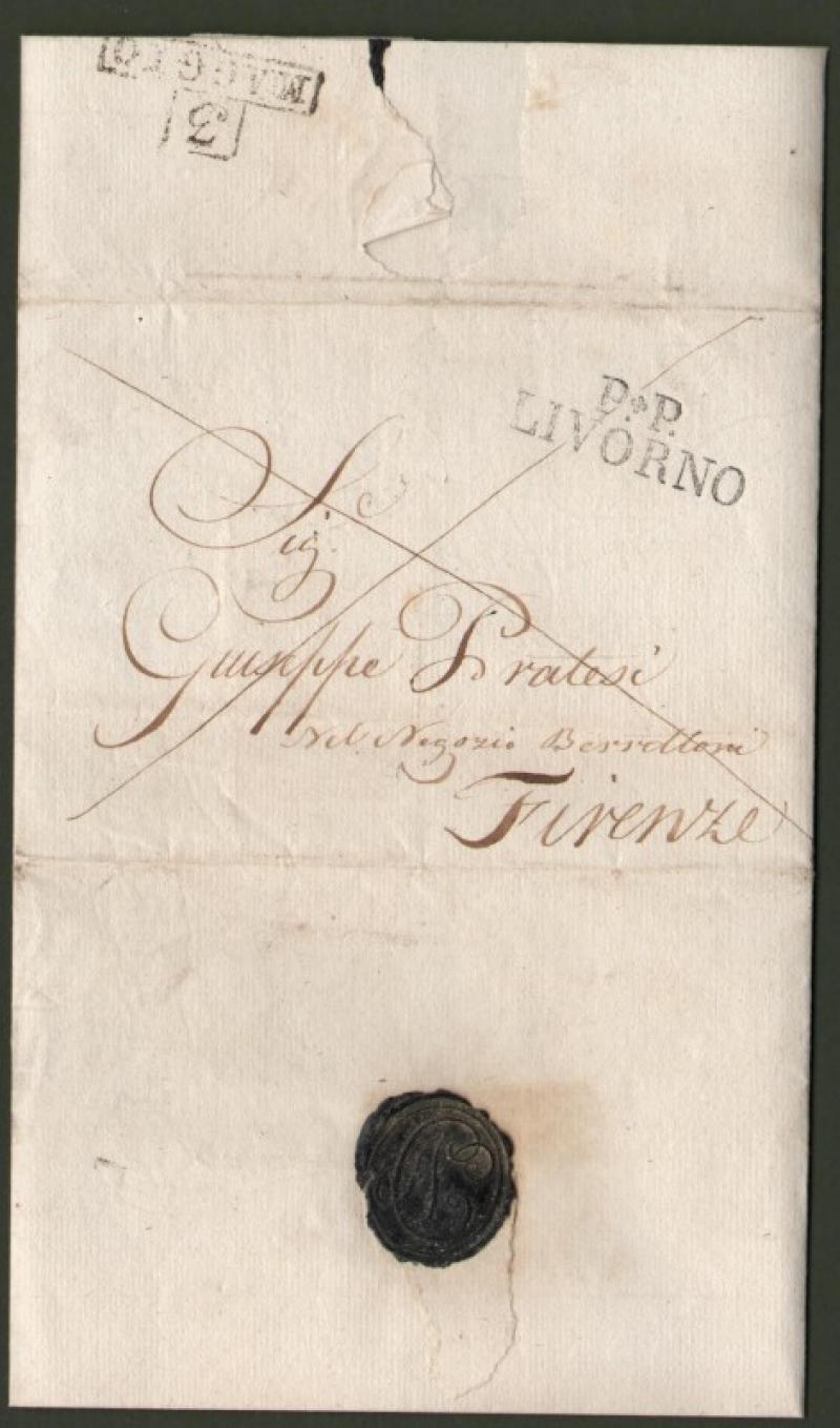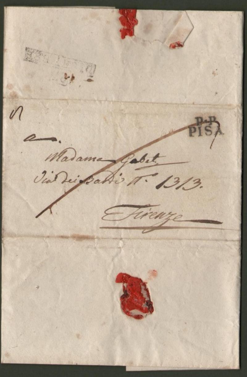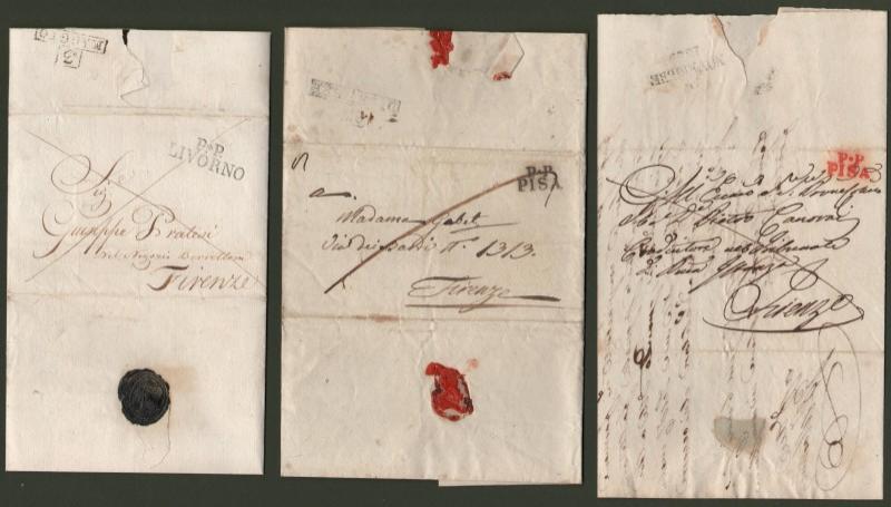 TOSCANA. P P LIVORNO (1823) - P P PISA (in nero 1825) - P P PISA (in rosso, 1839). 3 lettere in porto pagato per Firenze, complete di testo. (Rif.D7731)