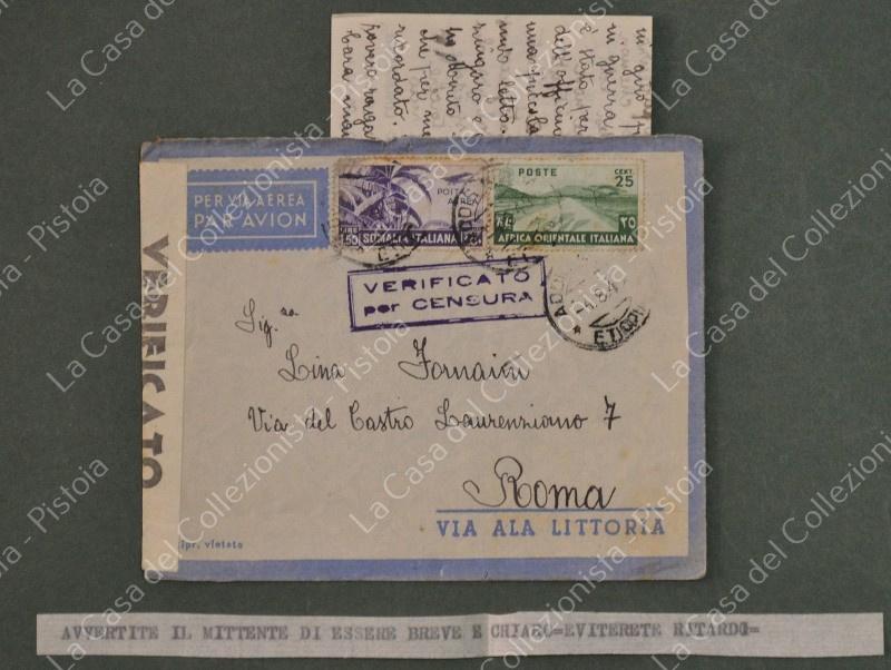 A. O. I.. Lettera da Addis Abeba del 4 agosto 1840 per Roma. Censurata. All'interno, oltre al testo, è presente una strisciolina di carta con cui il censore chiede di avvertire il mittente di essere più coinciso per evitare ritardi. (Rif.F7821)