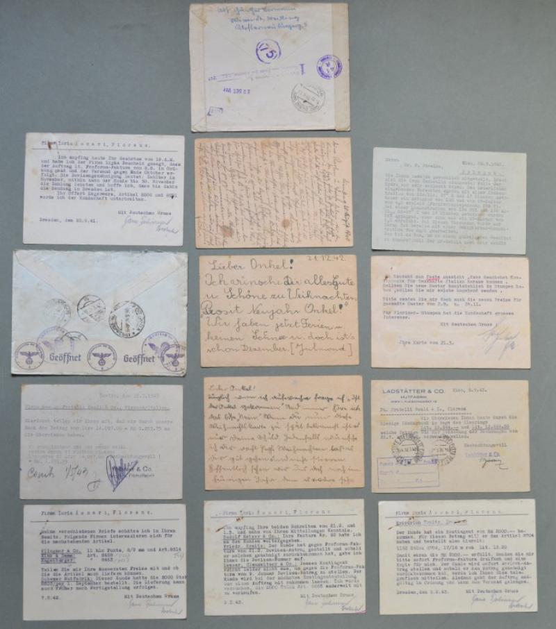 SECONDA GUERRA. Bolli di censura tedeschi e italiani. 13 tra lettere, cartoline postali e commerciali spedite a Firenze tra il 1940 e il 1943. Qualche difetto. (Rif.D4471)