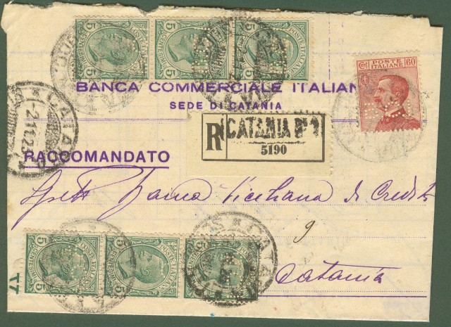 Raccomandata del 2.11.1925 affrancata con due strisce di tre cent. 5 Leoni + cent. 60 Michetti. Tutti perforati B.C.I. (Banca Commerciale Italiana). Alcune perforazioni sono capovolte. Ottima qualità . (Rif.B377)