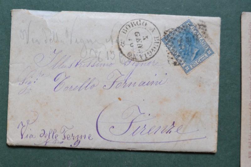 BORGO A BUGGIANO. Bollo nero sardo italiano. 2 bustine (con corrispondenza) e 2 cartoline postali. Periodo 1875 - 1901. (Rif.F7011)