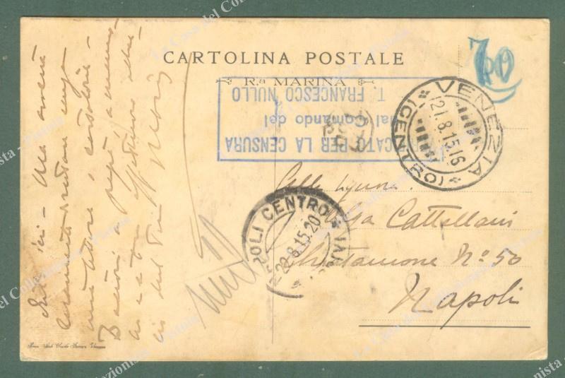 REGIO CACCIATORPEDINIERE FRANCESCO NULLO. Bollo azzurro di censura a recto di cartolina per Napoli del 1915. Ottima conservzione. (Rif.E3510)