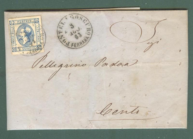 Storia postale. REGNO. Cent. 15 litografico 1° tipo (Sassone n. 12) su lettera da Pontelagoscuro (Ferrara) a Cento del 3.8.1863. OTtima qualità. (Rif.D4747)
