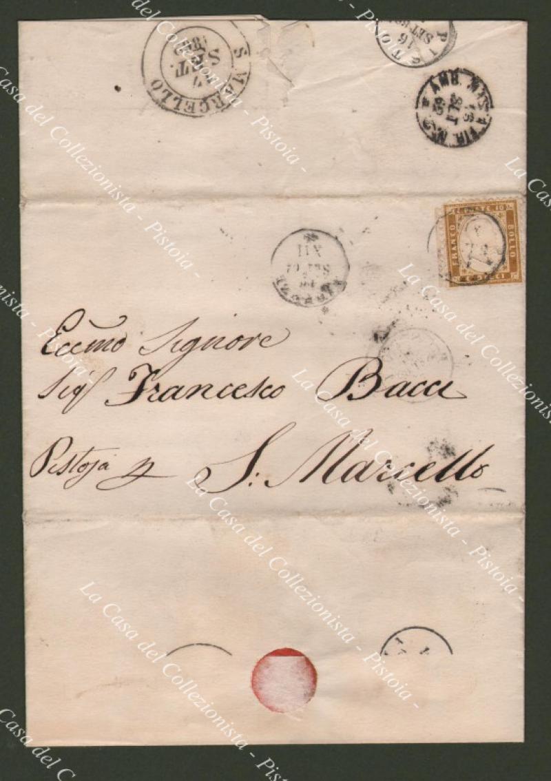 Storia postale REGNO D'ITALIA. Centesimi 10 bistro dentellato (Sassone n.1) su lettera del 16.9.1862 da Firenze a San Marcello. Fresca, completa di testo. (Rif.D6944)