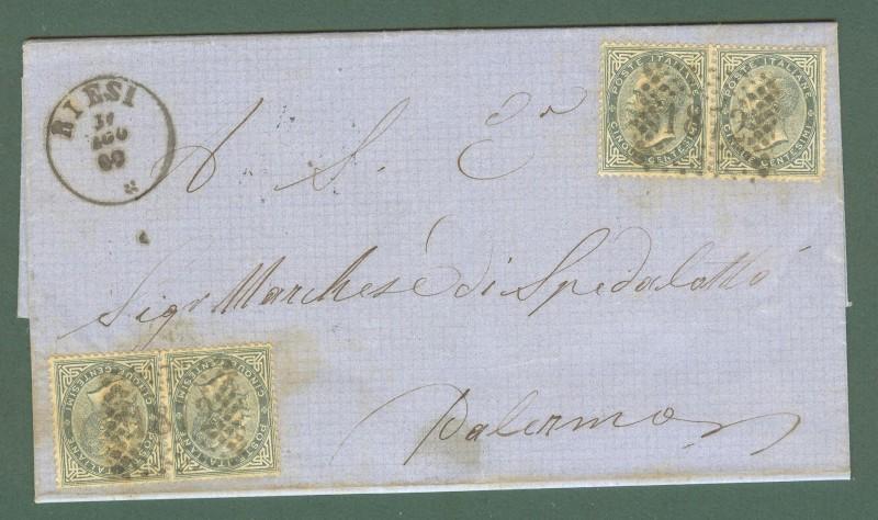 Storia postale. REGNO D'ITALIA. Due coppie del cent. 5 verde (Sassone T 16) su lettera del 1868 da Riesi (Caltanissetta) a Palermo. Lievi imperfezioni. E' presente il testo. (Rif.D2145)