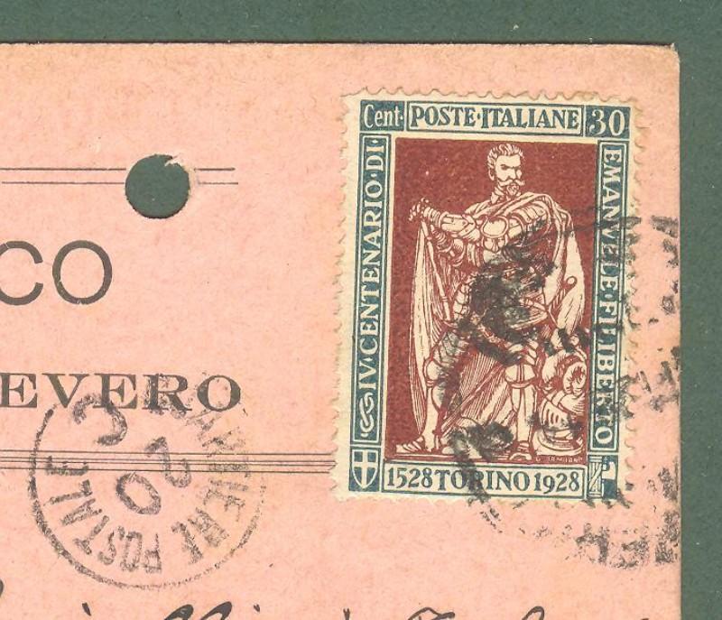 Storia postale. REGNO. Emanuele Filiberto cent. 30 dentellato 13 3/4 su cartolina del 1928. Sassone n. 232. Ottima qualità. (Rif.D4742)