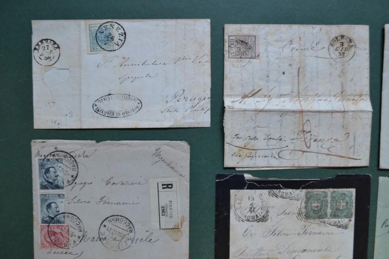 Storia Postale, Regno. Insieme composto da 22 tra lettere, raccomandate ed espressi (unica corrispondenza), una lettera del 1852 da Bologna a Firenze ed una parte di lettera del 1854 da Venezia a Perugia.