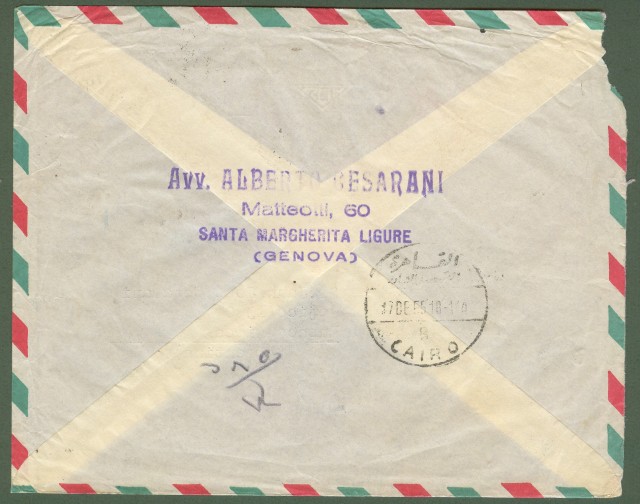 Repubblica. Aerogramma. Lettera raccomandata del 14.12.1955 per l'Argentina affrancata con lire 25 Matteotti + lire 200 Siracusana. Erroneamente inviata al Cairo (Egitto). (Rif.B6675 - storia postale)