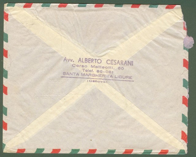 Repubblica. Aerogramma. Lettera raccomandata del 19.12.1959 per l'Argentina affrancata con lire 25 e lire 100 Siracusana + lire 60 Europa + lire 500 Donatello filigrana stelle 1. Buona qualità . (Rif.B6667 - storia postale)