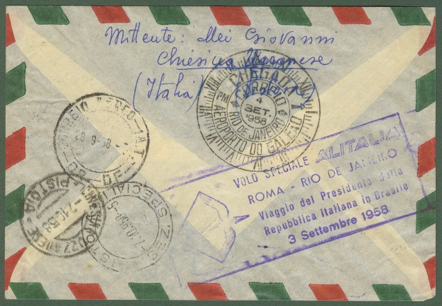 Repubblica. Volo speciale del 3.9.1958. Visita del Presidente della Repubblica in Brasile. Aerogramma raccomandato. Bolli d'arrivo. Ottima qualità . (Rif.B6503)