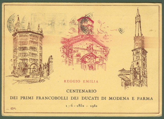 Repubblica. Annullo a targhetta del centenario dei francobolli di Modena e Parma. Alone su un lato. (Rif.B6432 - storia postale)