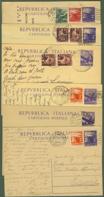 Sei cartoline postali tipo democratica. Tre da lire 4 e tre da lire 8. Buona conservazione. (Rif.B1751)