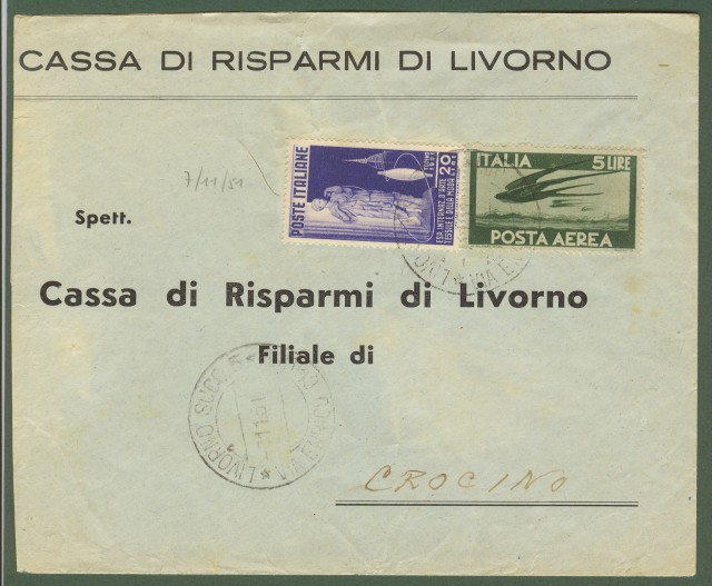 Lettera del 7.11.1951 affrancata con lire 5 Posta Aerea Democratica + lire 20 violetto Arte Tessile. La busta è stata un pಠrifilata sul lato sinistro, per il resto buona qualità per freschezza e dentellatura. (Rif.B1738)