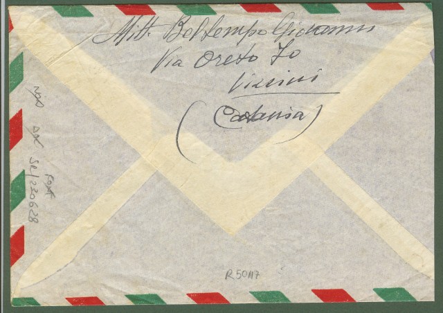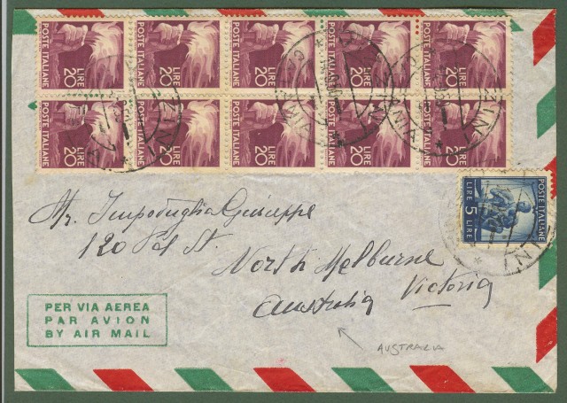 Aerogramma del 14.9.1950 per l'Australia affrancato con lire 5 Democratica + blocco di dieci lire 20 Democratica. La qualità è ottima sia per la freschezza che per la dentellatura; il lato sinistro è stato un pಠrifilato per l'apertura. (Rif.B1733)