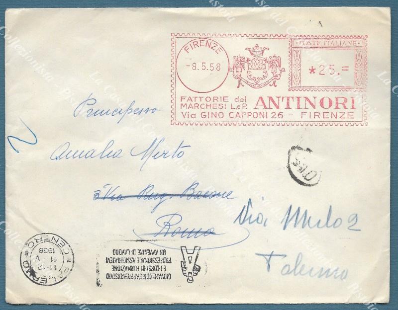 ANNULLO MECCANICO ROSSO. FATTORIE ANTINORI. 8 maggio 1958. Lettera per Roma. (Rif.F3435)