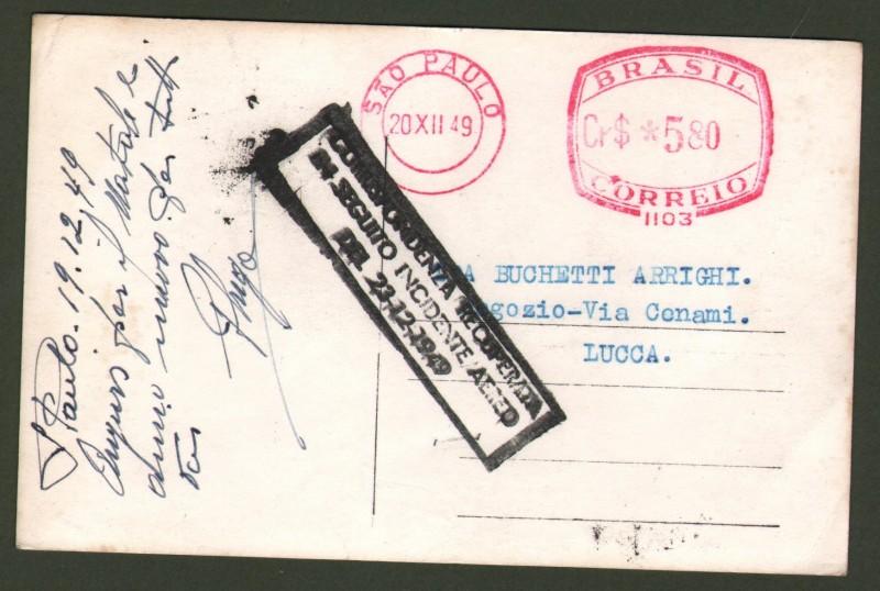 INCIDENTE AEREO. Cartolina del 20 dicembre 1949 da San Paolo a Lucca. Bollo in cartella CORRISPONDENZA RECUPERATA IN SEGUITO INCIDENTE AEREO 23-12-1949. Ottima qualità. (Rif.D7449)