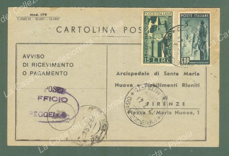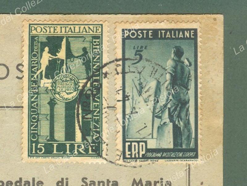 ITALIA REPUBBLICA. Lire 5 ERP + lire 15 Biennale Venezia su avviso di ricevimento del 11.7.1949. Francobolli ben dentellati. (Rif.E4278)