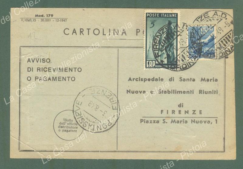 ITALIA REPUBBLICA. Lire 5 ERP + lire 15 Democratica su avviso di ricevimento del 3.8.1949.