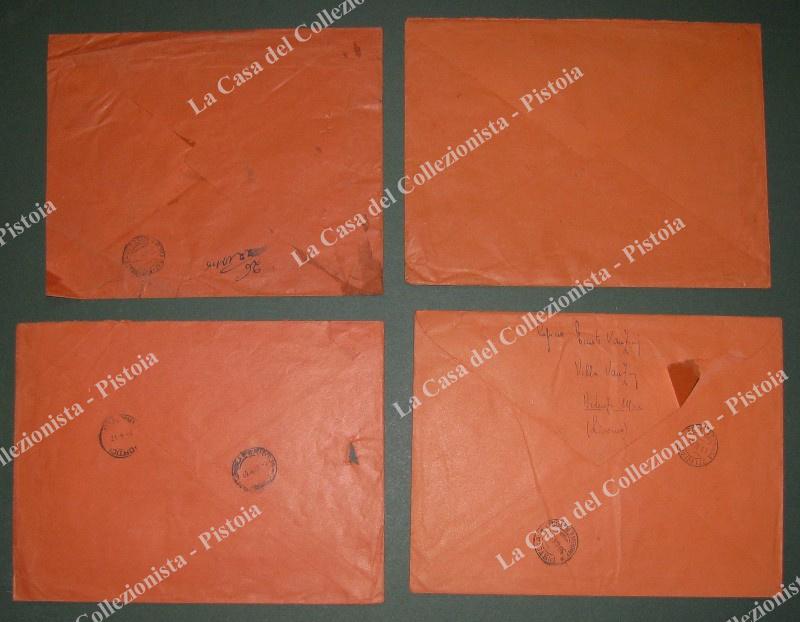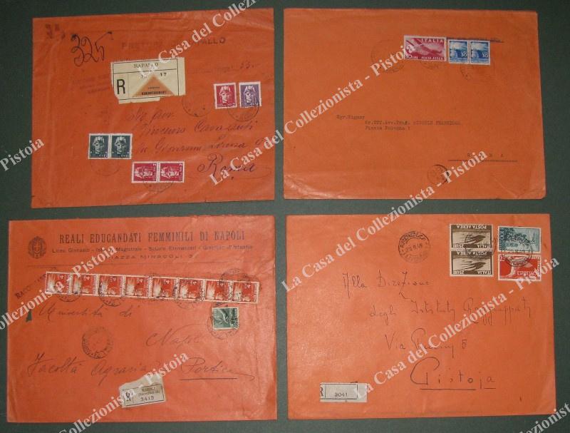 LUOGOTENENZA-REPUBBLICA. 1945/48. Quattro raccomandate, buste di dimensioni cm 22x18 circa. Una con valori gemelli, una con striscia di 8. Tutti i francobolli sono ben conservati eccetto quello espresso da lire 25 arancio che ha uno strappetto sulla parte inferiore. (Rif.E3529)