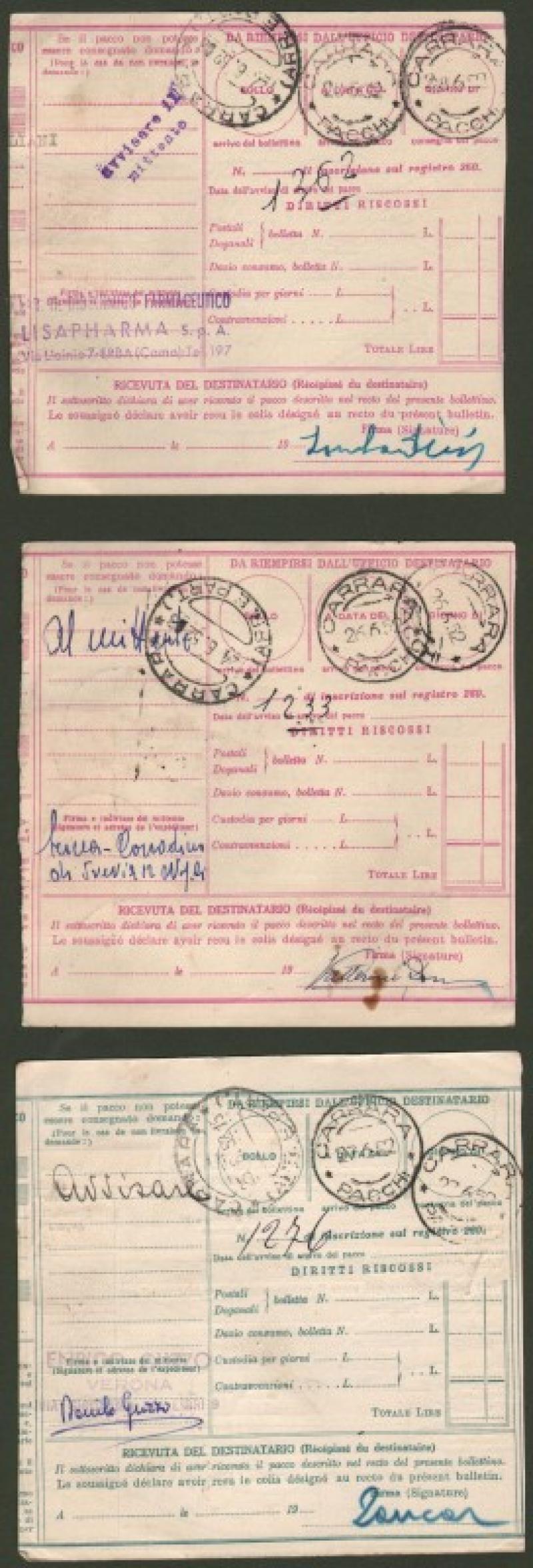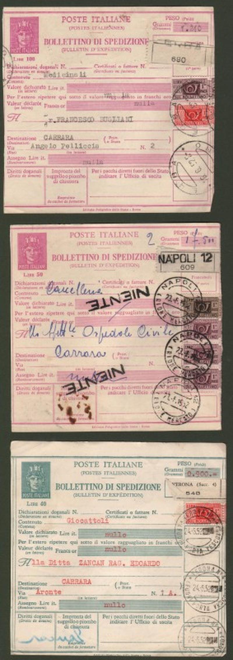 Repubblica. 3 BOLLETTINI DI SPEDIZIONE da lire 40, lire 50 e lire 100 usati nel 1952.