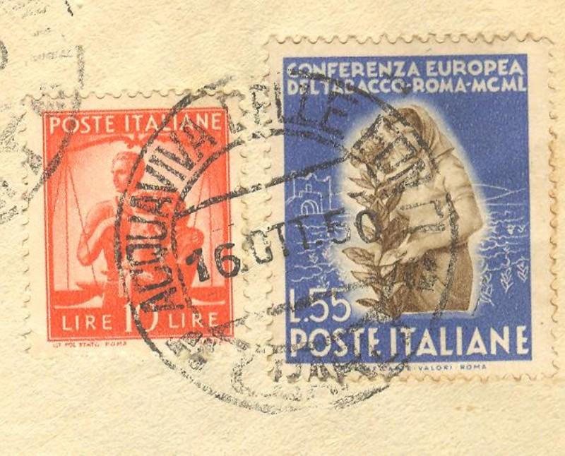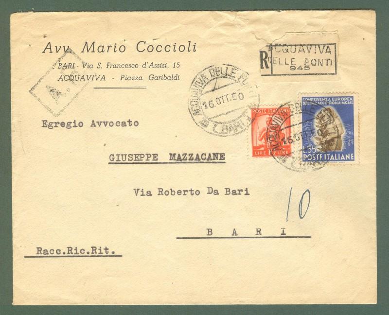 Storia postale. REPUBBLICA ITALIANA. Lettera raccomandata del 16.10.1950.