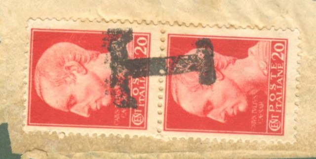 Storia postale ITALIA LUOGOTENENZA. Modulo con tassa a carico del destinatario del 04.07.1945 da Lecce a Copertino (Le). Tassa assolta con coppia cent. 20 rosso luogotenenza. Francobolli ben dentellati, imperfezioni al modulo. (Rif.C9076)