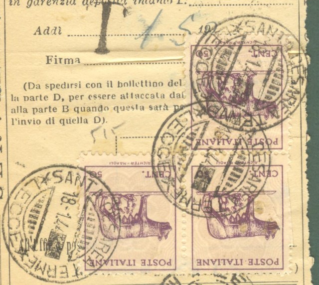 Storia postale ITALIA LUOGOTENENZA. Modulo delle Poste per il servizio pacchi, Lecce 18.01.1944. Ad assolvere l'importo dovuto (lire 1,50) apposti (al posto di segnatasse) tre esemplari del cent. 50 lilla, tipo Lupa Capitolina, con filigrana esagoni (Sassone n.515). Un esemplare ha uno strappo (dovuto alla mancata parziale dentellatura)