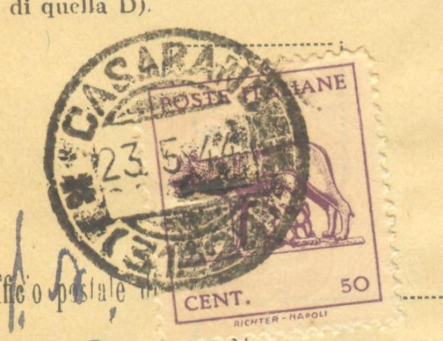 Storia postale ITALIA LUOGOTENENZA. Modulo delle Poste per il servizio pacchi, Lecce 20.05.1944. Ad assolvere l'importo dovuto (cent. 0,50) apposto (in luogo di segnatasse) un esemplare del cent. 50 lilla, tipo Lupa Capitolina, senza filigrana (Sassone 515A). Ottima qualità . (Rif.C9069)