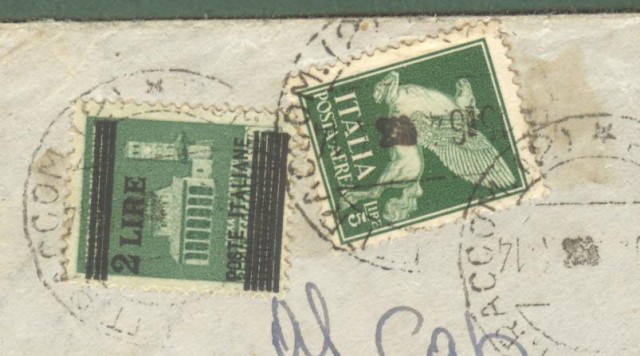 Storia postale ITALIA LUOGOTENENZA. Raccomandata del 15.06.1945 da Roma a Firenze. Affrancata con lire 2 verde Monumenti Distrutti sovrastampato + lire 5 verde Posta Aerea Imperiale. Francobolli ben dentellati. (Rif.c9066)