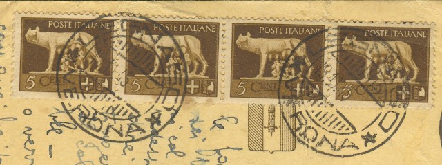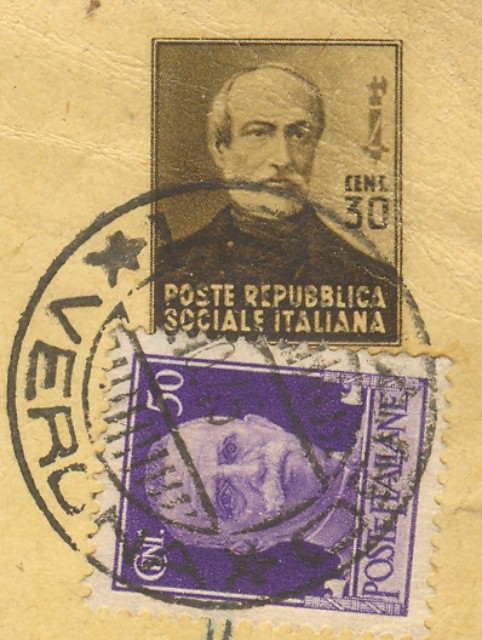 LUOGOTENENZA. CARTOLINA POSTALE da Legnago (Verona) a Verona il 18.10.1945. Affrancata con cent. 30 Mazzini con aggiunti cent. 50 violetto + striscia di quattro cent. 5 bruno serie Imperiale. Una leggera piega attraversa verticalmente la cartolina interessando un francobollo da cent. 5; altre imperfezioni ai bordi. (Rif.C2354 storia postale)