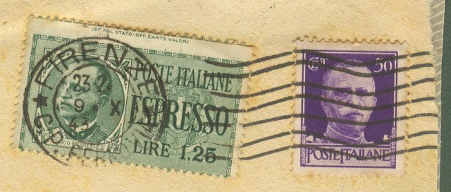 R.S.I. VARIETA'. Espresso del 9.10.1943 da Firenze per S.Giovanni Valdarno (Arezzo). Affrancato con cent. 50 Imperiale + lire 1,25 verde espressi regno con dentellatura spostata in alto (officina carta valori è sopra la vignetta e non sotto). (Rif.C2352 storia postale)