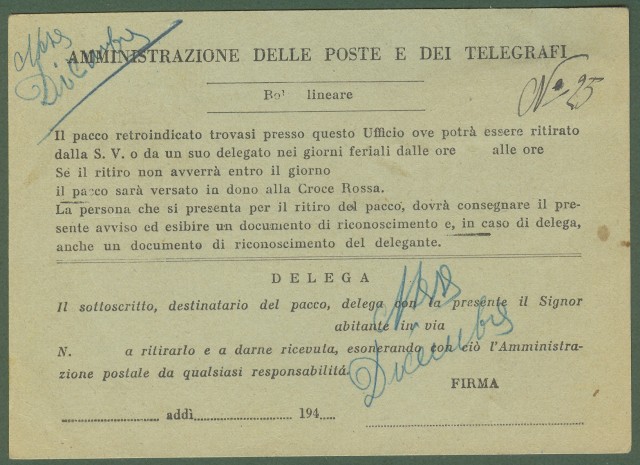 LUOGOTENENZA. AVVISO DI PACCO del 30.12.1944.