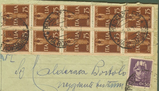 Luogotenenza. Notificazione di atto giudiziario del 1.8.1945 da Piacenza a Casalpusterlengo. Affrancata con cent. 50 Luogot. + dodici pezzi (coppia + blocco di dieci) del cnet. 75 P.A. Imperiale. I francobolli sono ben dentellati; la busta non è molto fresca ed ha qualche strappetto laterale. (Rif.B3963)