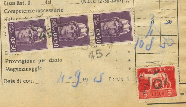 Bolletta di consegna di corriere del 4.9.1945 affrancata con striscia di tre cent. 50 + lire 5 Luogotenenza. Ottima qualità . (Rif.B342)