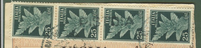 Modulo vaglia (parte A) del 18.3.1946 con applicata (ad integrare la tassa) striscia di quattro cent. 25 Posta Aerea Imperiale. Una piega su un francobollo. (Rif.B423)
