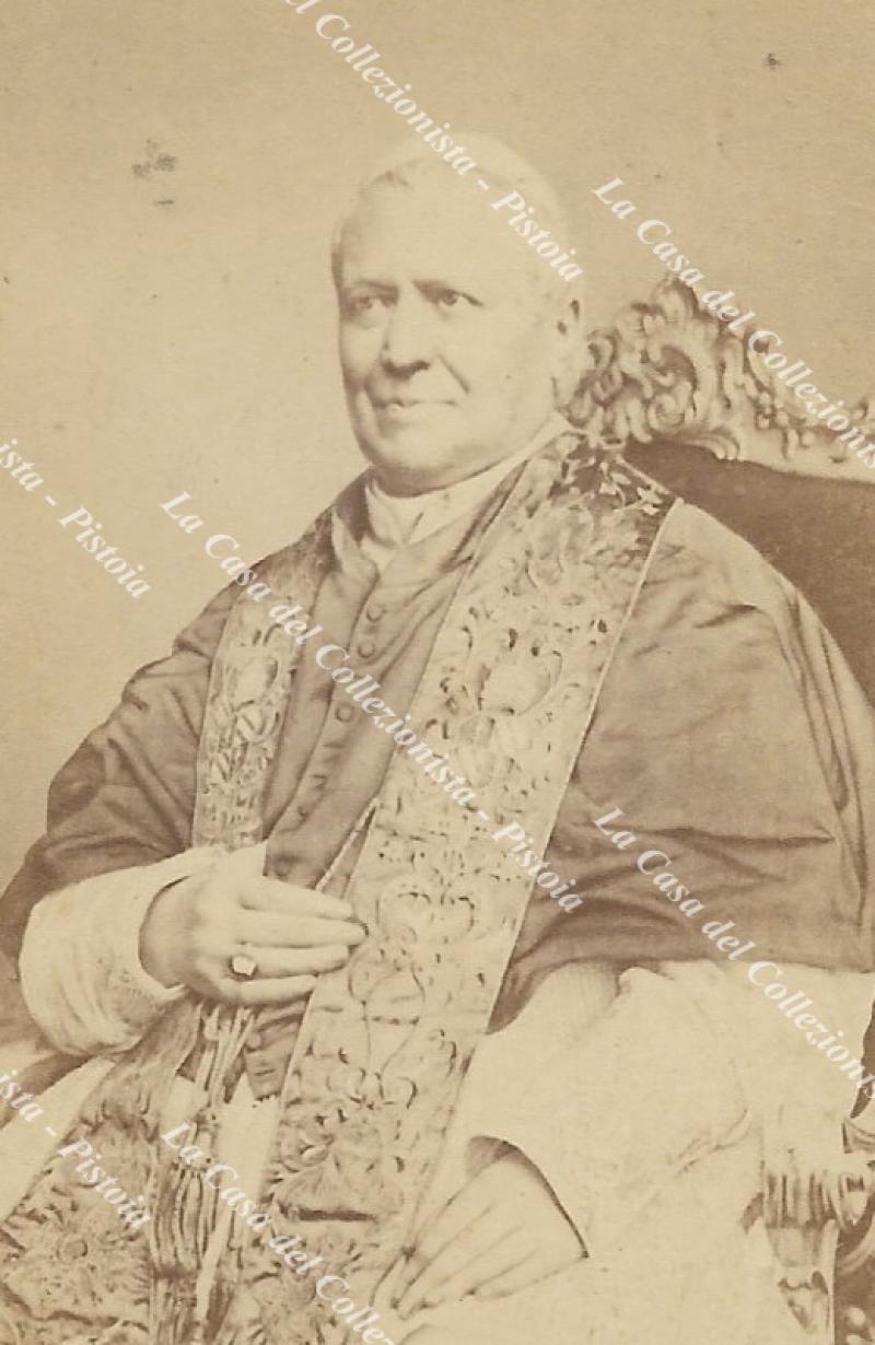 PIO IX, (nato Giovanni Mastai Ferretti, 1792 – 1878), Papa dal 1846. Raffigurato seduto. Foto all’albumina (circa 1870).