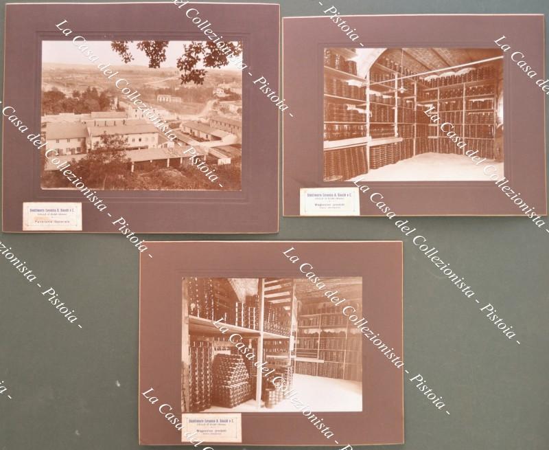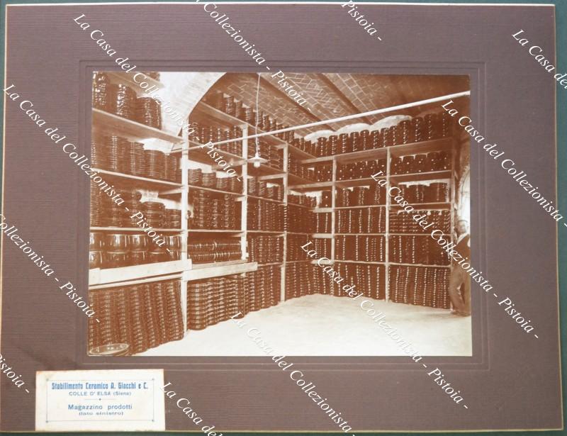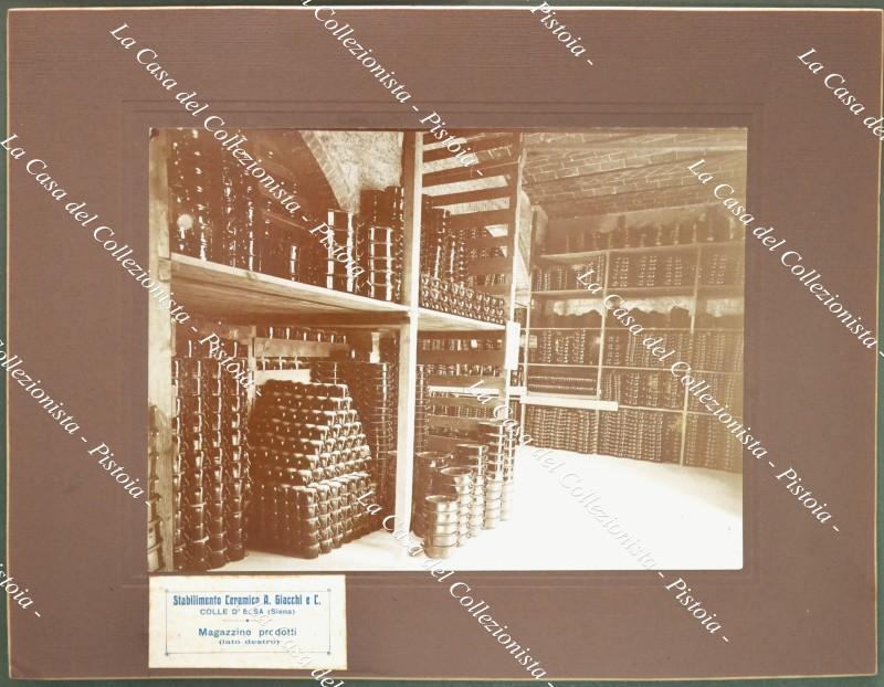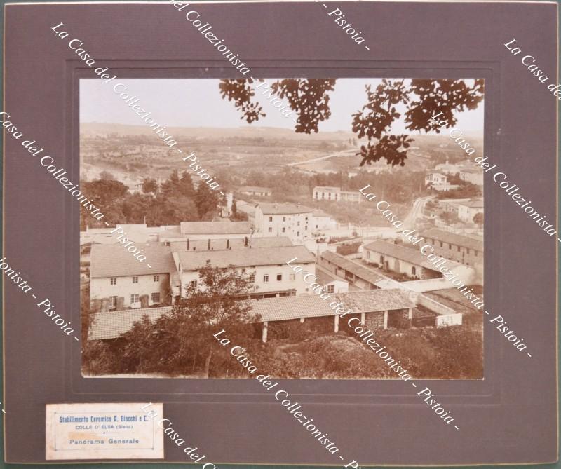 COLLE VAL D'ELSA (Siena). Stabilimento Ceramico A. Giacchi & C.. Insieme di tre fotografie originali all'albumina databili ai primi anni del 1900. Una di cm 26x19,5 (su cartoncino di cm 35x30) mostra il panorama generale, due di cm 23x17 (su cartoncino di cm 33x25) mostrano scorci interni dello stabilimento. Buona conservazione. (Rif.F0440)
