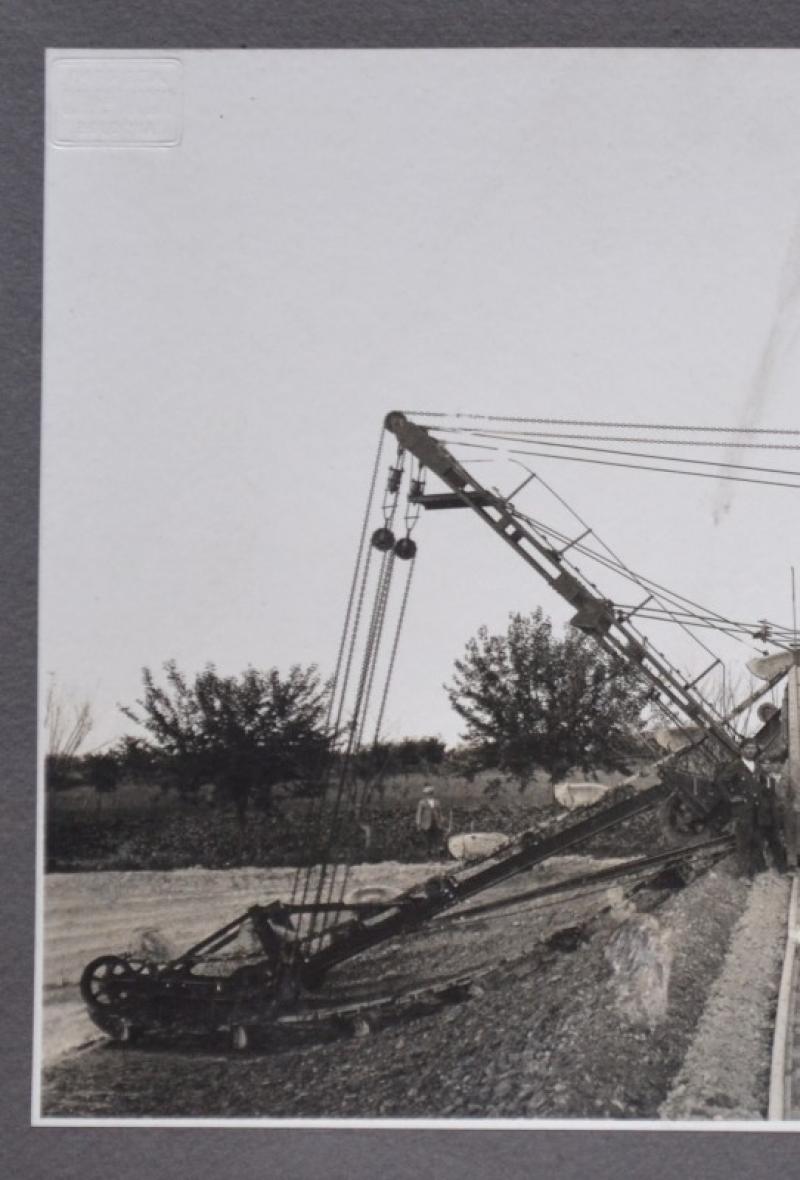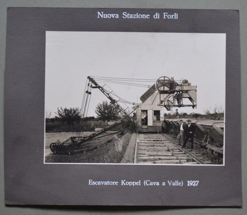 (Ferrovie – Forlì) NUOVA STAZIONE DI FORLI’. ESCAVATORE KOPPEL (CAVA A VALLE) 1927. Impresa F.lli Toschi di Bologna. Foto in bianco e nero, bellissimi primi piani animati, 1927, di cm 22x16 su Cartoncino di cm 34x24. Ottima conservazione, eccetto leggera piccola abrasione. (Rif.D3490)