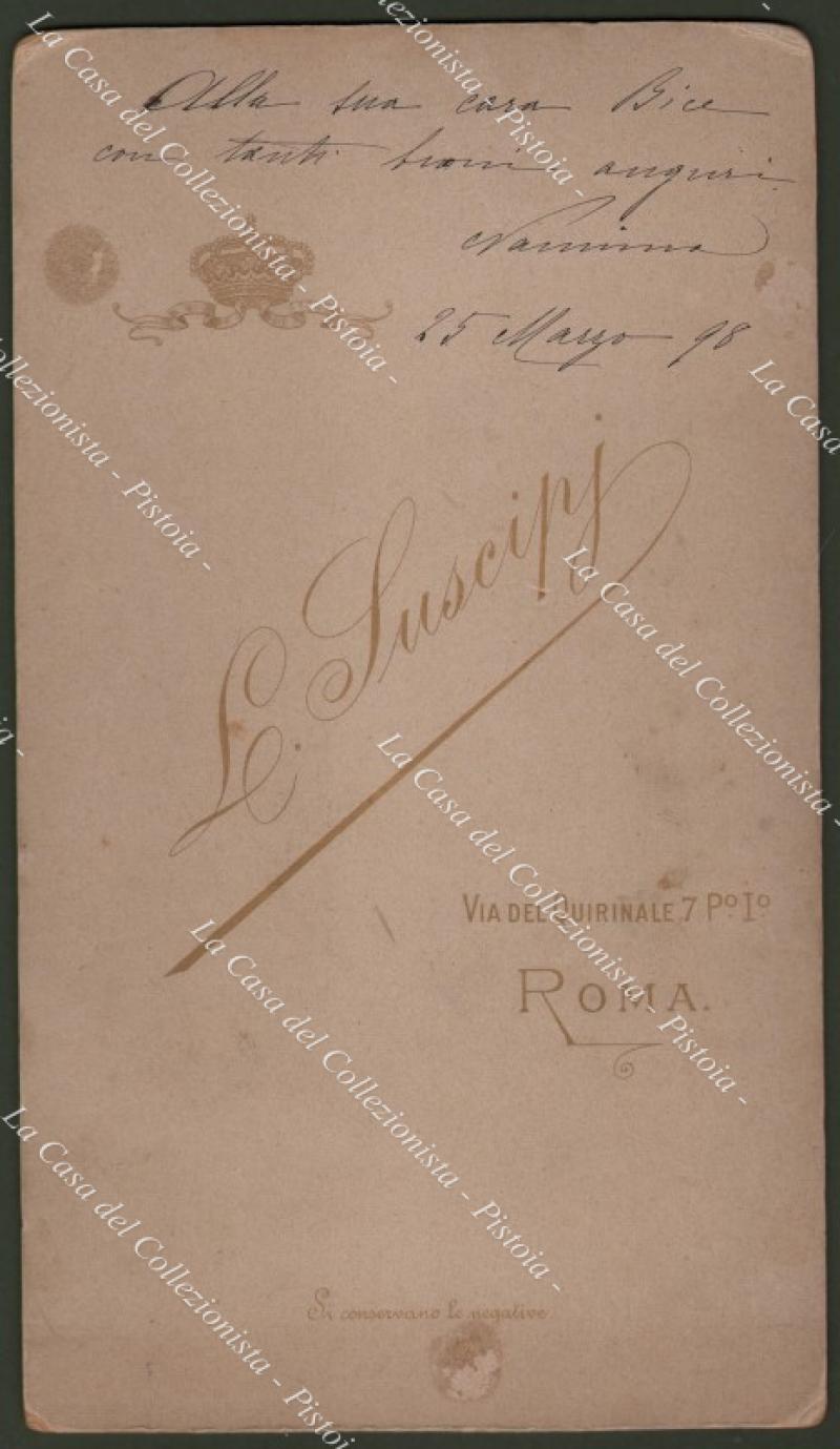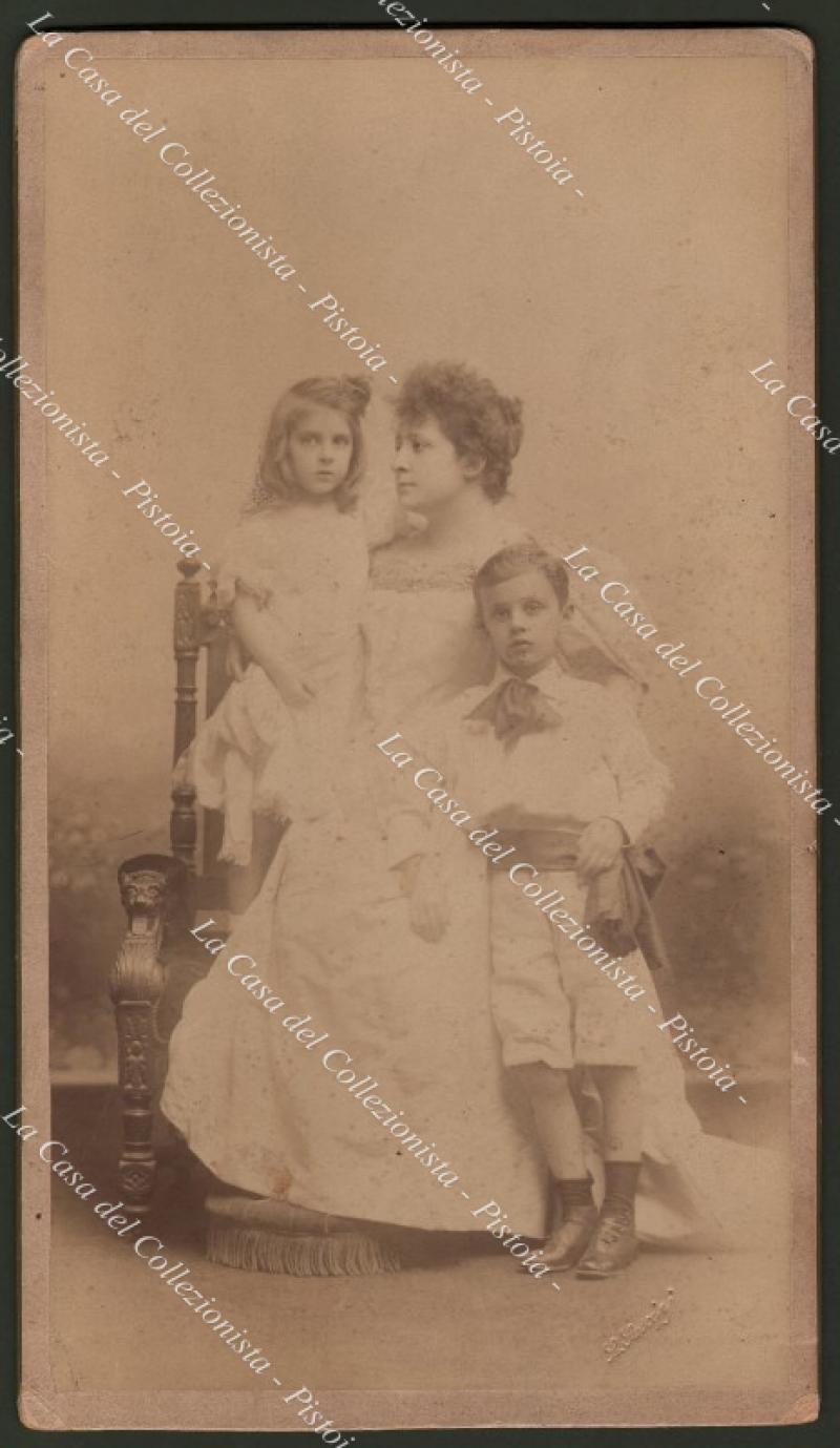 Foto d'epoca raffigurante una madre con due bambini. Scattata dallo Studio Lorenzo Sucipj di Roma e realizzata con la tecnica dell'albumina. Misura cm 23x12,7 ed è montata su cartoncino dello studio fotografico (cm 13,8x24,1). A retro dedica a firma "Nannina" e data "25 marzo 1898". A retro leggeri segni di precedente montaggio. (Rif.F0433)