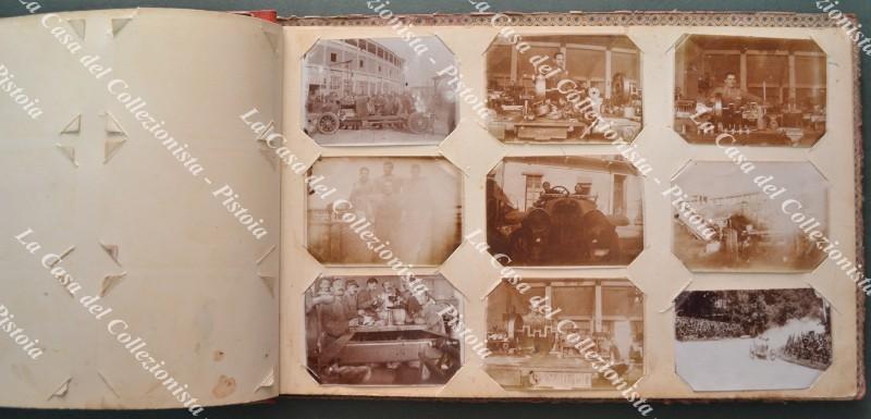 LO STADIUM di TORINO. Nel 1909 nel luogo ove era la Piazza d’Armi fu costruito un imponente complesso sportivo polivalente denominato “Stadium” capace di 70.00 spettatori. ALBUM di cm 33x21 con i piatti in cartone contenente, uniti da un cordino, 4 fogli con applicate 29 foto per lo più di cm 8,5x6 ed un permesso permanente del I° Stabilimento Distaccato del Deposito Centrale Automobilistico presso lo Stadium. Mostrano interni d’officina, primi piani di soldati e vedute parziali del complesso. L’insieme è databile tra il 1917 e l’inizio del 1918. Ottima conservaz. eccetto usure ai piatti in cartone. Insieme raro. (Rif.F0618-74)
