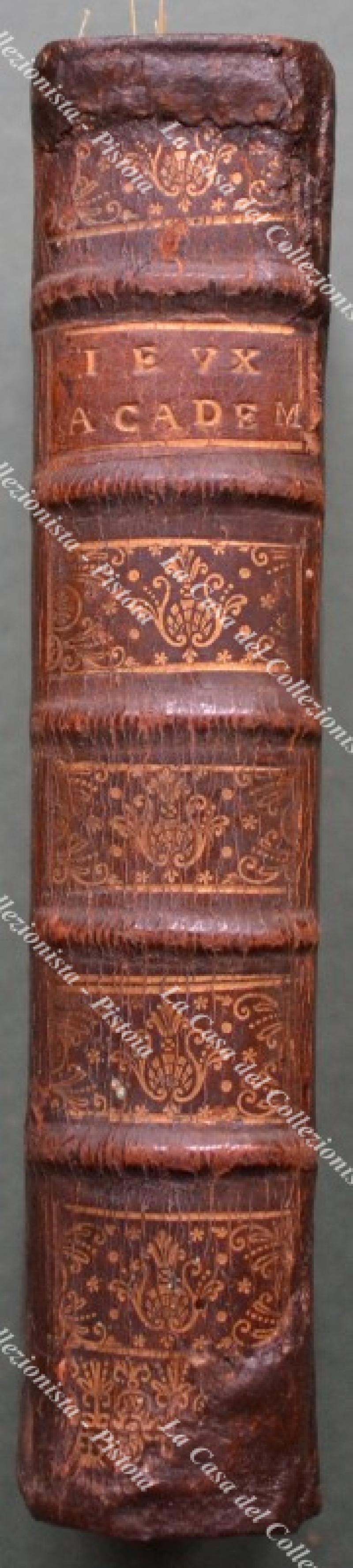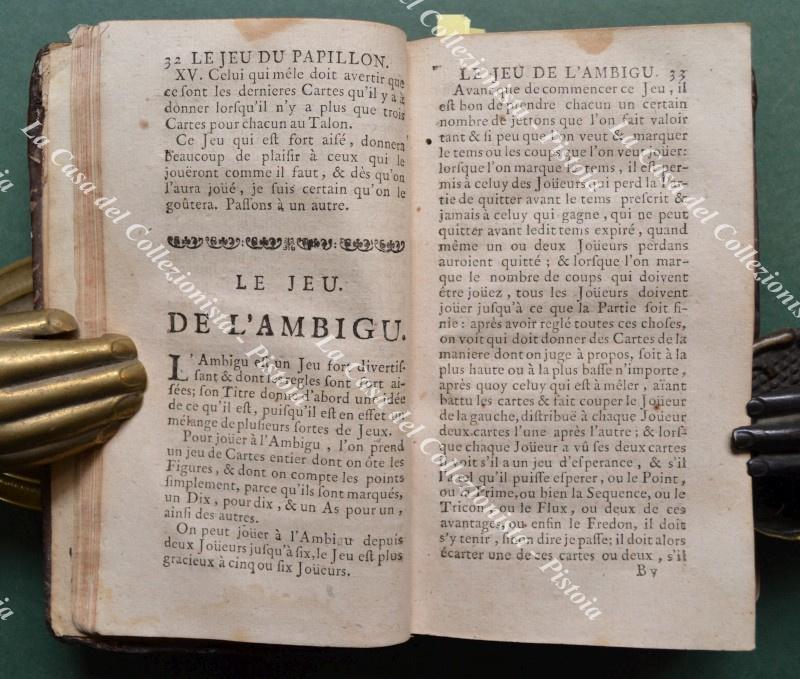 (Giochi ediz. '700) ACADEMIE UNIVERSELLE DES JEUX. Contenant les regles des jeux du Trictrac, des Echecs, du Quadrille, du Quintille, de l'Hombrea trois, du Piquet, du Reversis; & de tout des àutres jeux. AVEC Des Instructions faciles pour apprendre a les bien jouer. Paris, Chez Theodore Legras, 1725. Cm 9,2x16,3, legatura coeva in prima pelle con al dorso nervi e fregi e titolo in oro. Frontespizio inciso, seguono pagine 6 non numerate, pagine 354, pagine 170, pagine 4 non numerate, pagine 52, pagine 6 non numerate. Restauri professionali al dorso e punte; interno buono eccetto forellino di tarlo al margine interno di gran parte delle pagine; vecchia scrittad'eppartenenza al frontespizio e aloncino al margine superiore delle prime 90 pagine. (Rif.F7825-77)