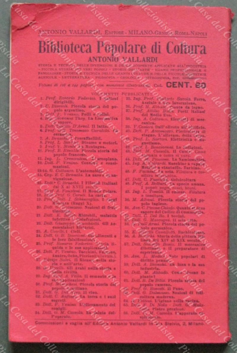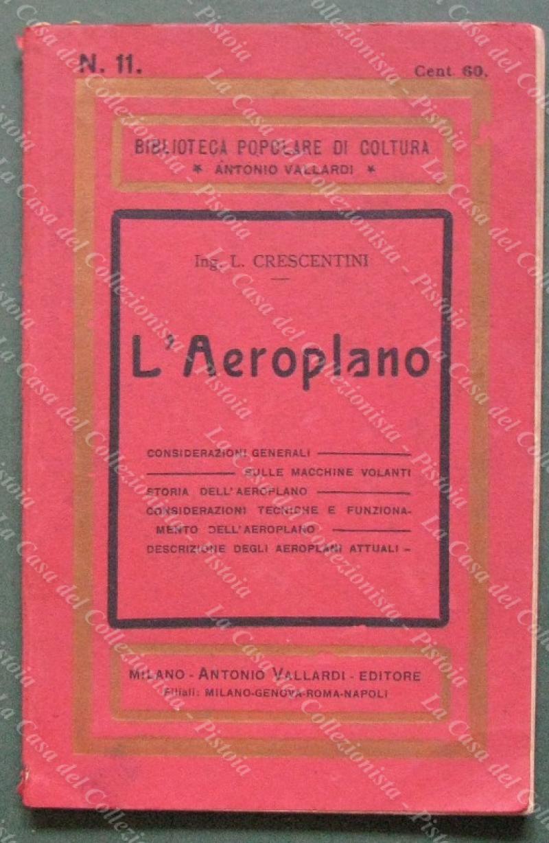 Aviazione. CRESCENTINI L.. "L'AEREOPLANO. Considerazioni generali sulle macchine volanti - Storia dell'aereoplano- Considerazioni tecniche e funzionamento - Descrizione degli aerei attuali". Milano, Vallardi, 1915. Cm 12x18,5, brossura editoriale, pagine 128 con 58 illustrazioni. Piccolo strappetto ricomposto, ad un angolo del piatto posteriore. Buona conservazione. (Rif.E5881)