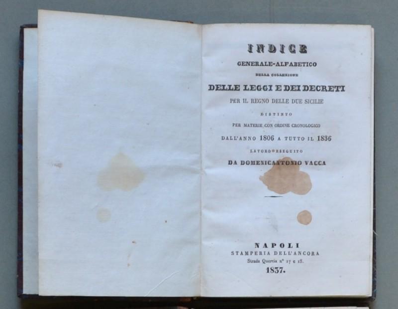Diritto - Regno delle Due Sicilie. VACCA DOMENICO ANTONIO. "Indice generale della collezione delle leggi..." Napoli, 1837