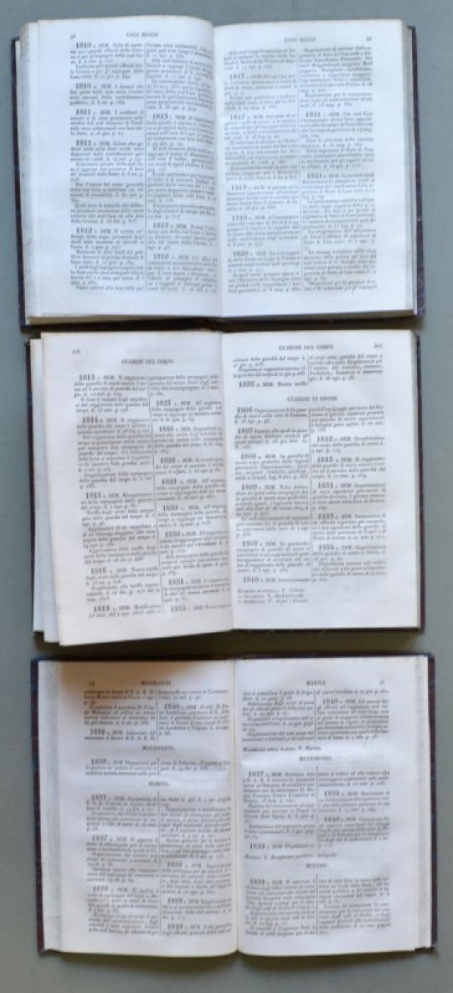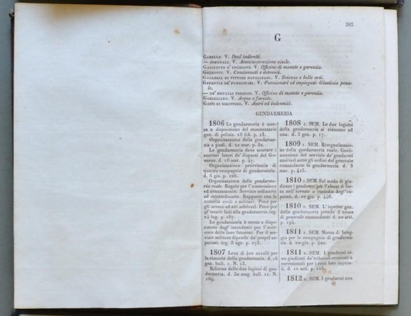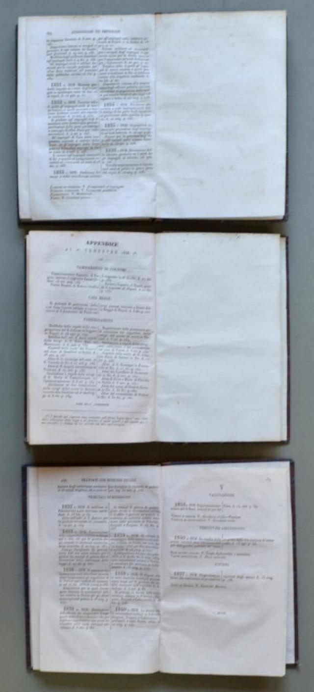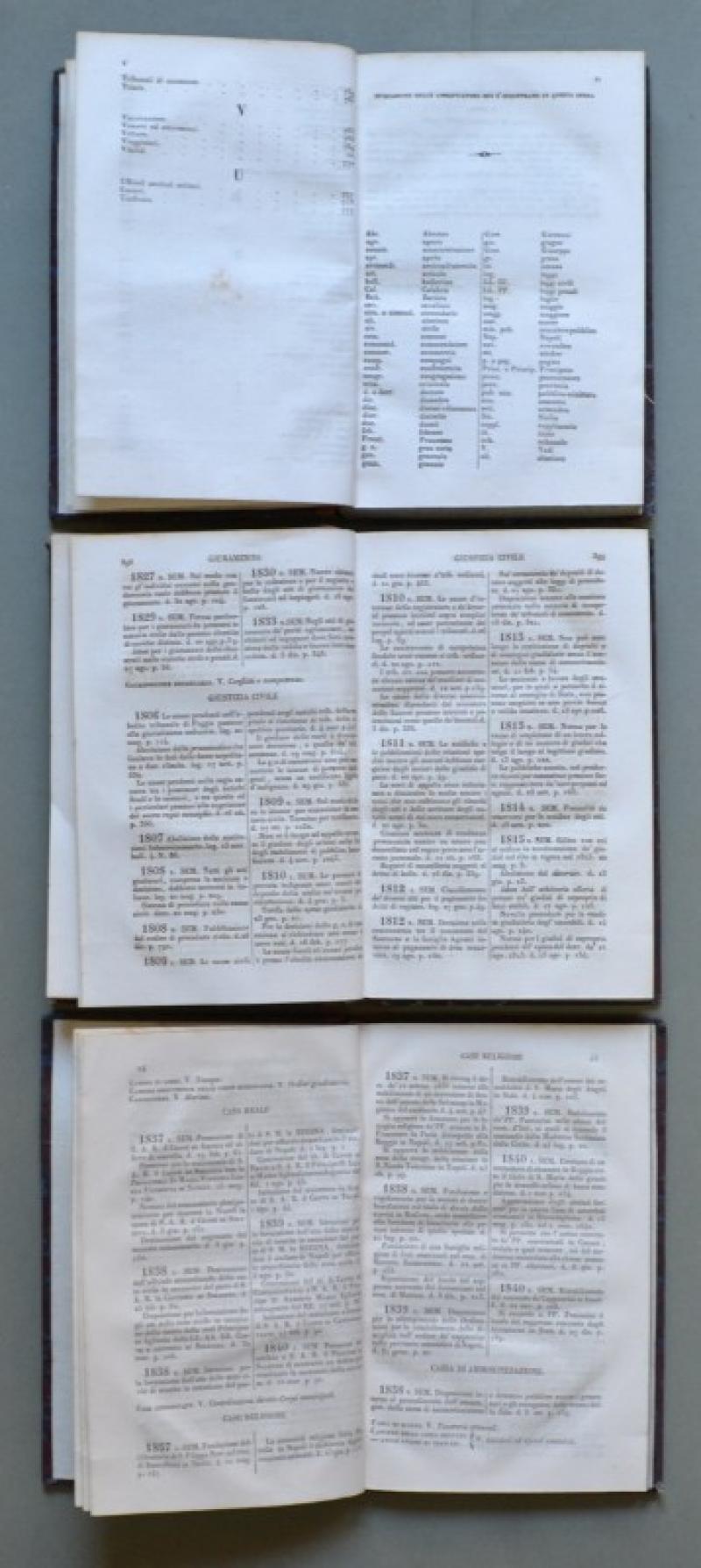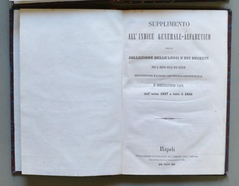 REGNO DELLE DUE SICILIE. Distinto per materie con ordine cronologico dall’anno 1806 a tutto il 1836. Napoli, Stamperia dell’Ancora, 1837. In 8° (cm 12,7x20). Due volumi di pagine complessive XI + 778. VACCA DOMENICO ANTONIO SUPPLIMENTO ALL’INDICE GENERALE-ALFABETICO DELLA