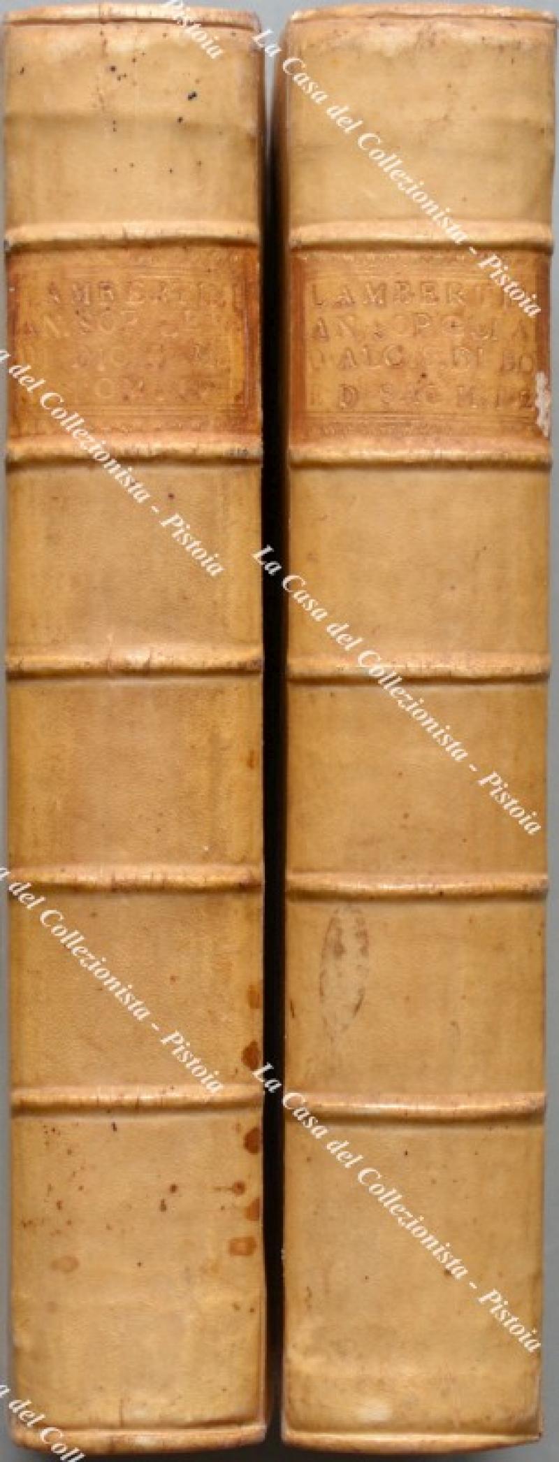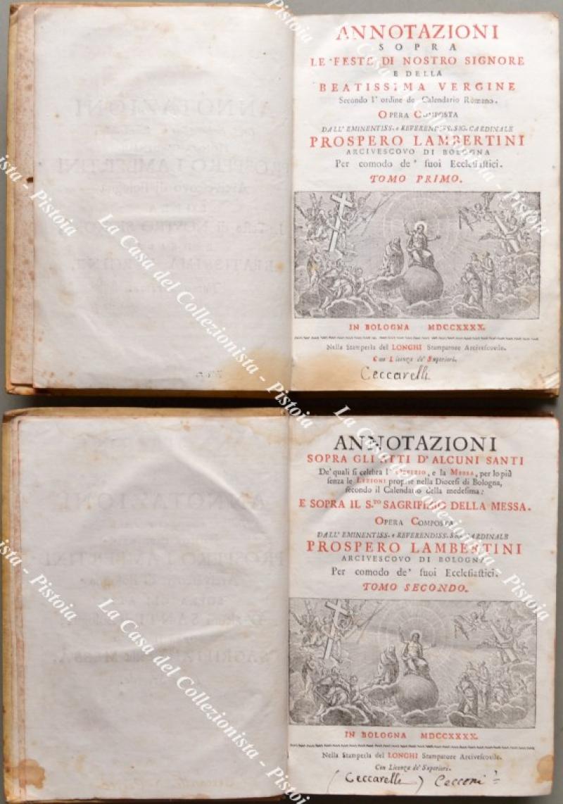 (Feste religiose – ‘700) LAMBERTINI PROSPERO (Papa Benedetto XIV).ANNOTAZIONI SOPRA LE FESTE DI NOSTRO SIGNORE E DELLA BEATISSIMA VERGINE SECONDOL’ORDINE DEL CALENDARIO ROMANO. Bologna, Stamperia del Longhi, 1740. In 8° (cm 17,5x25), belle legature in piena pergamena coeva (minimi segni’uso) con nervi e tit. in oro ai dorsi. Due volumi di pp. XXX + XIV + 633 e pp. 12 non numerate + 668.Legature solide, frontespizio in rosso e nero,tagli spruzzati, interni in buona conservazione eccetto qualche ingiallimento e debole alone,macchiate le pp. 554/556 del secondo volume. (Rif.D3468-76)