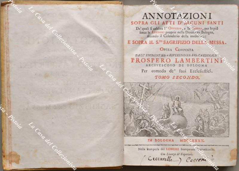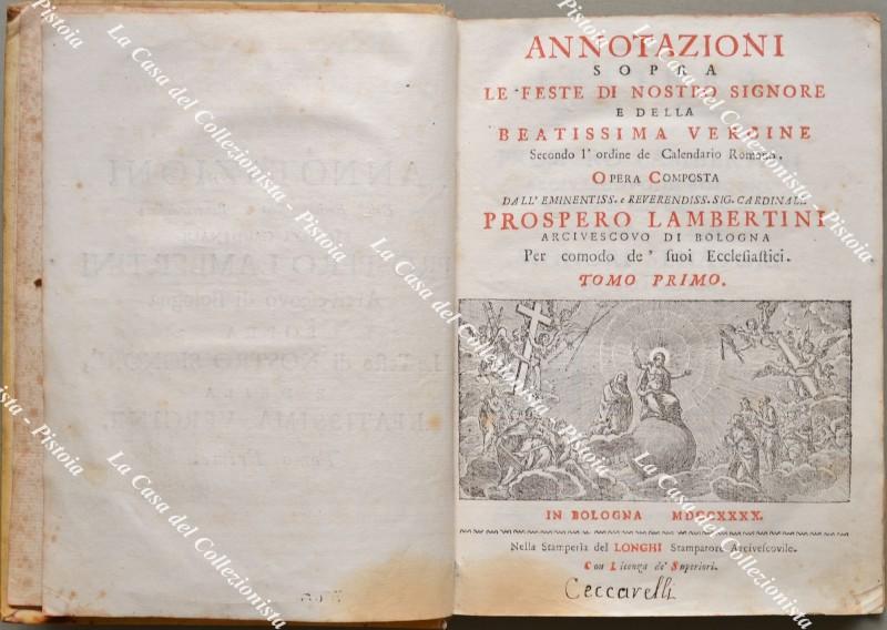 (Feste religiose – ‘700) LAMBERTINI PROSPERO (Papa Benedetto XIV).ANNOTAZIONI SOPRA LE FESTE DI NOSTRO SIGNORE E DELLA BEATISSIMA VERGINE SECONDOL’ORDINE DEL CALENDARIO ROMANO. Bologna, Stamperia del Longhi, 1740.