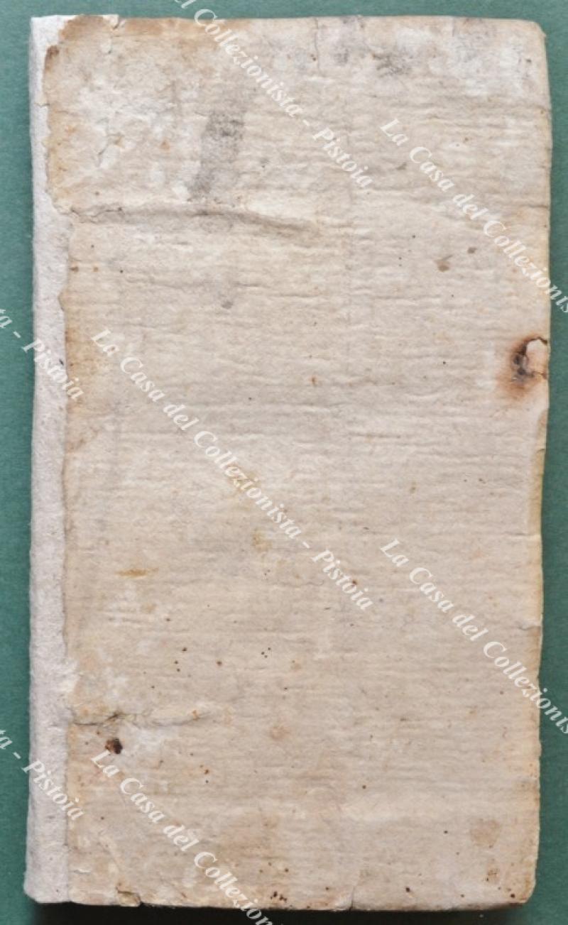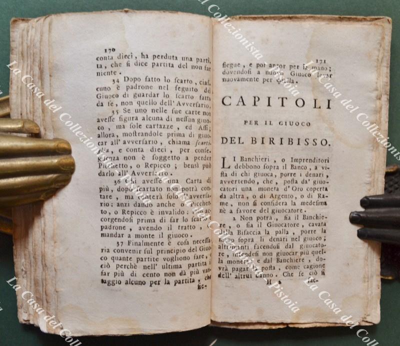 (Giochi - ediz. '700) BISTEGHI RAFFAELLO. IL GIUOCO PRATICO o sieno CAPITOLI DIVERSI Che servono di regola ad una raccolta di Giuochi più pratricati nelle Conversazioni d'Italia. Al Nobile, ed Eccelso IL SIGNO CONTE OVIDIO BARGELLINi. In questa Ristampa al quanto accresciuti e ricorretti. Edizione seconda. Colle Ameno, 1760. Cm 8x15, cartonatura coeva. Pp. 184. In barbe. L'interno a parte minimi ingiallimenti è in buona conservazione, la legatura in cartone è stata restaurata (dorso rifatto, spellature e bruniture ai piatti). Raro trattato del XVIII secolo sui giochi da tavolo e di carte comuni dell'epoca. (Rif.F8055-77)